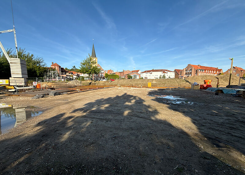 In Emsbüren wird derzeit in zentraler Lage ein Wohn- und Geschäftshaus errichtet. Im Erdgeschoss sind Praxisflächen für Physiotherapie/Krankengymnastik mit Reha-Sport- und Fitnessbereich vorgesehen. In den Obergeschossen entstehen 24 Eigentumswohnungen mit ca. 50 bis 103 m², jeweils mit Loggia oder Dachterrasse. Zwei Aufzüge gewährleisten eine barrierearme Erschließung; einer bindet das Kellergeschoss mit 19 Garagenstellplätzen an. Ein Atrium mit Laubengängen dient der internen Erschließung. Das Energiekonzept kombiniert Photovoltaik, Wärmepumpe und moderne Klimatechnik.